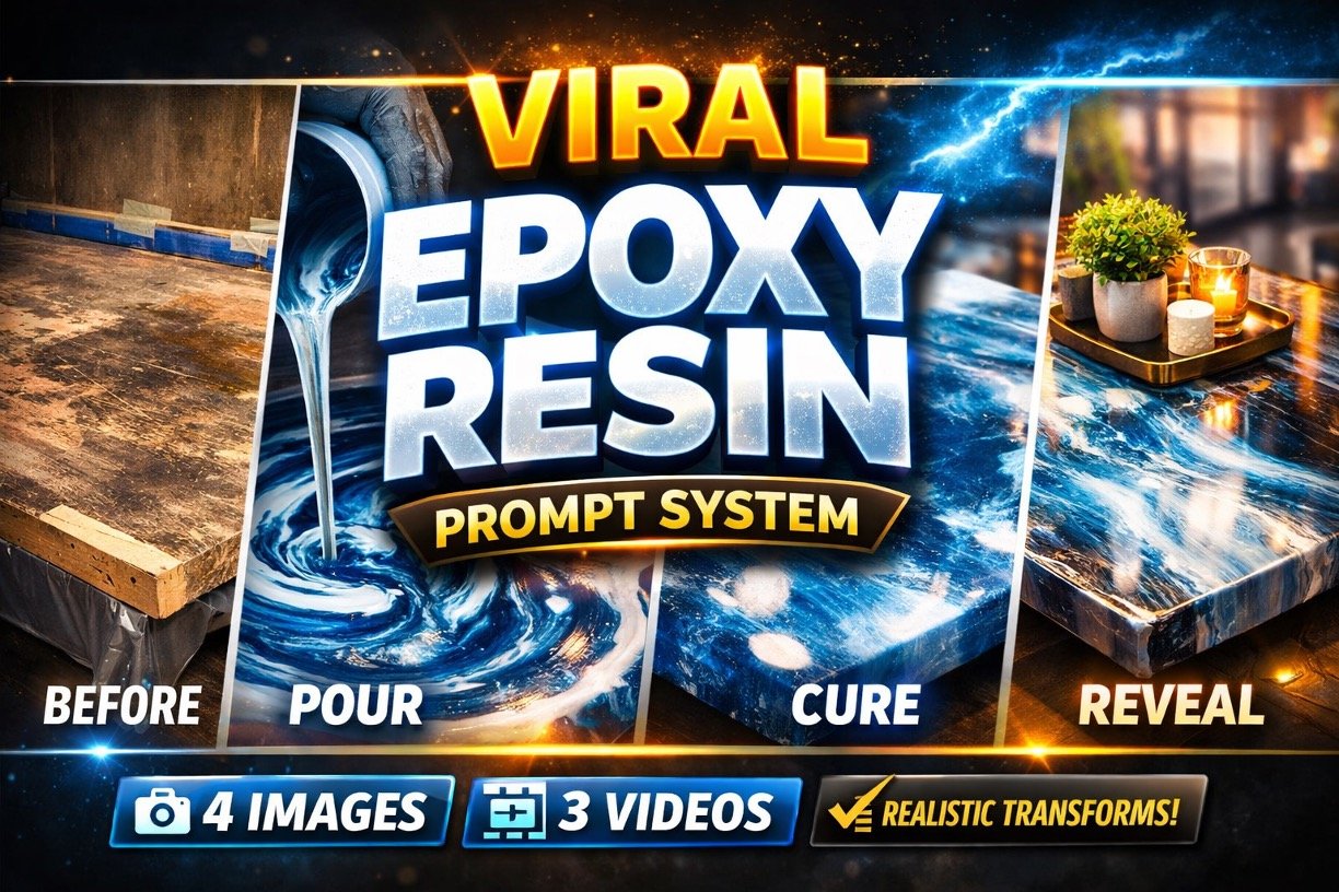 👉 Produces 3 frame-to-video prompts that animate realistic epoxy steps (mixing, pouring, self-leveling, bubble popping, curing, sanding, polishing, staging).